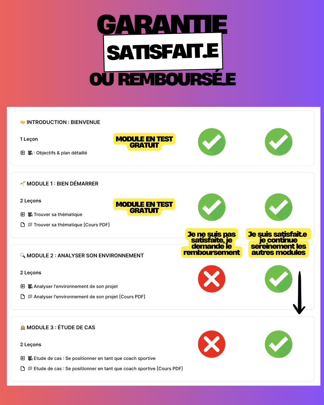 Tu as une garantie satisfait ou remboursé : tu peux tester les deux premiers modules gratuitement.